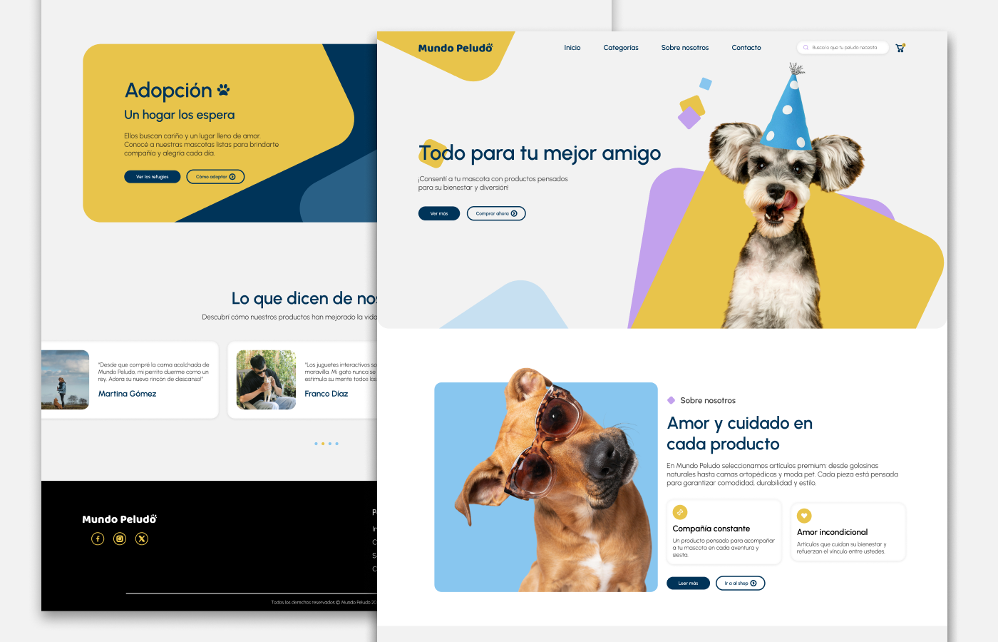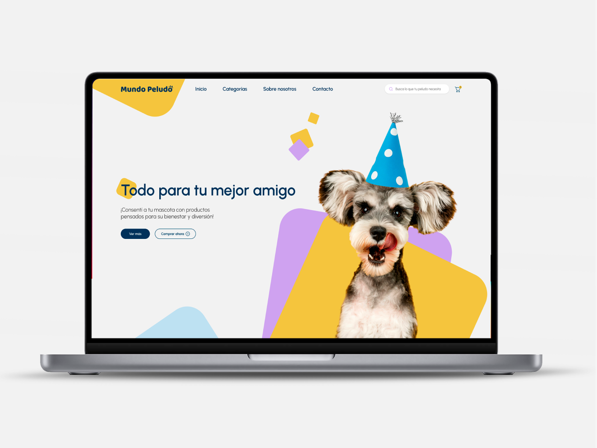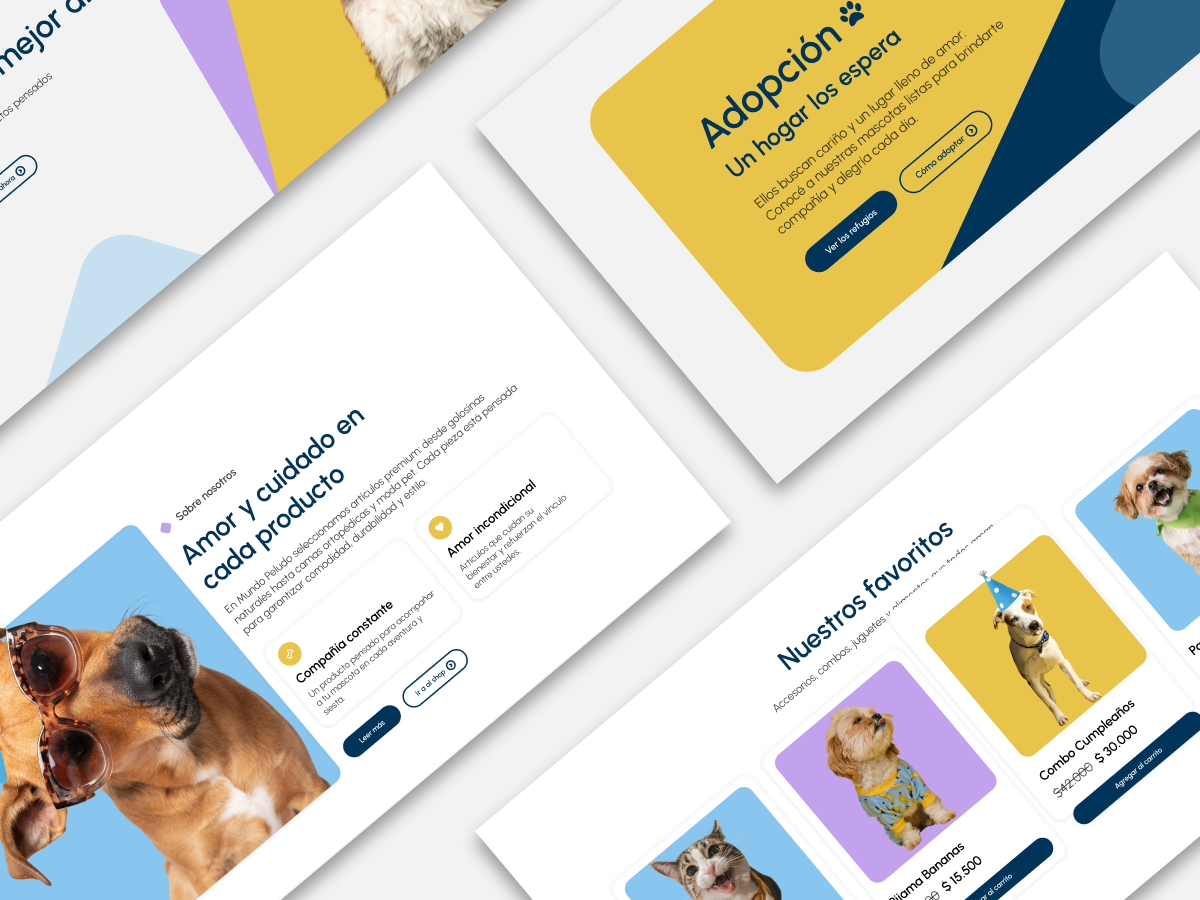 Mundo Peludo Diseño UX/UI web con animaciones, donde la interacción y el movimiento acompañan la experiencia del usuario y refuerzan la identidad visual del proyecto. Categoría UX/UI Cliente Mundo peludo